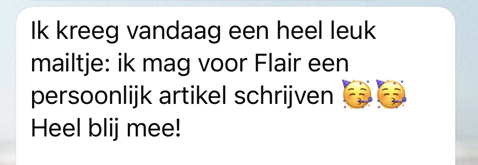 De groep en ik staan over een paar weken voor je te juichen als jij magazines open slaat en daar jouw verhaal mooi opgemaakt ziet shinen